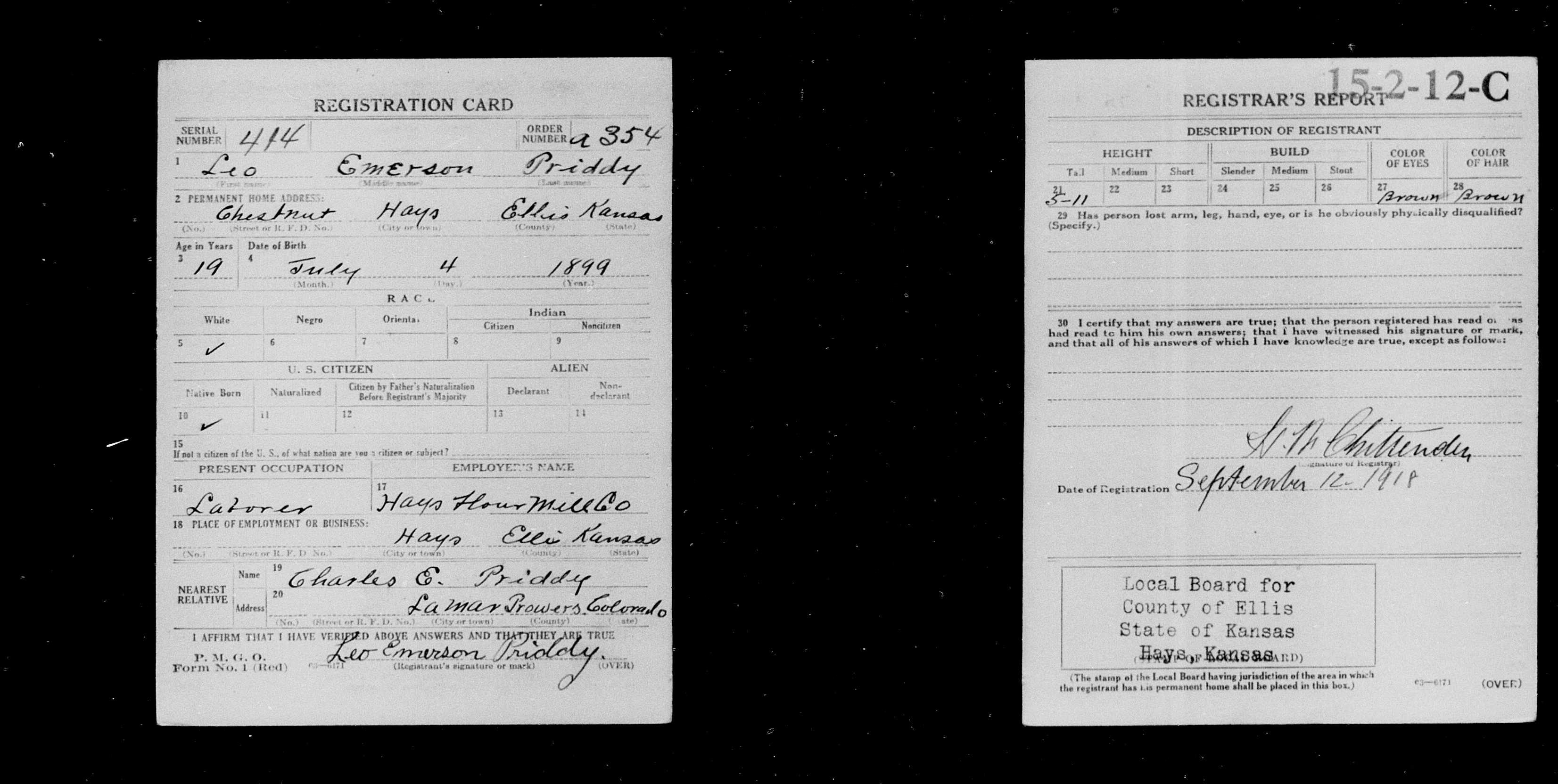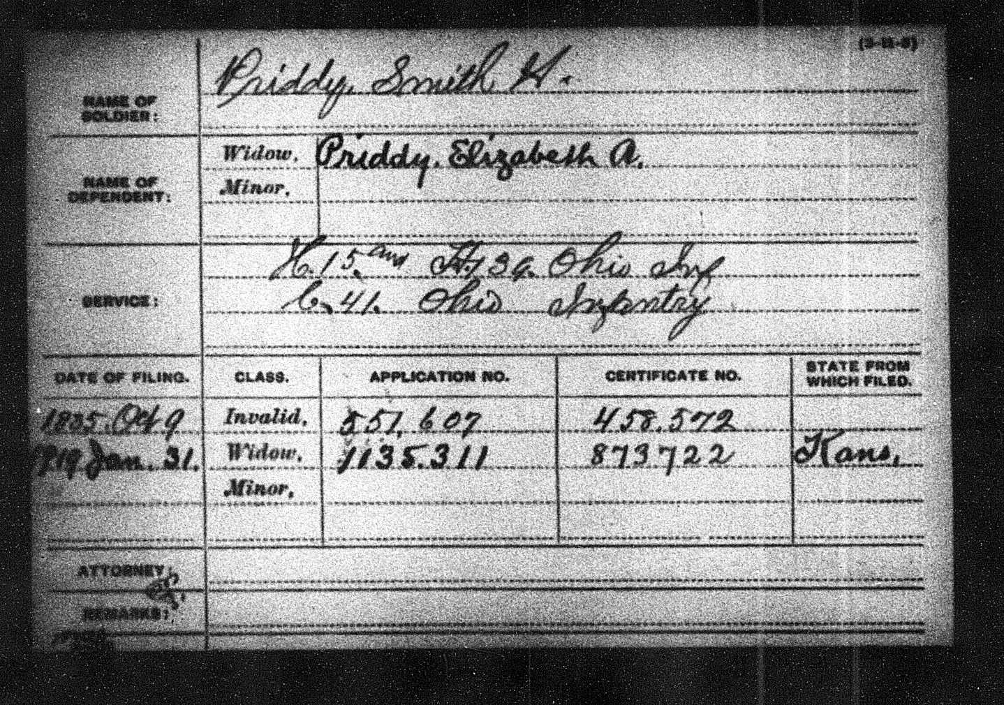 Ancestor Smith A. Priddy’s service recordKingman County, Kansas Census of 1900. Smith A. Priddy, his wife Elizabeth, and his daughter Nora, are on line 66, 67, 68. Smith moved to Kansas late in life; his occupation is listed as “pensioner.”Clyde’s father Leo’s WWI draft cardLeo Priddy & Isabelle Velie’s marriage certificate.