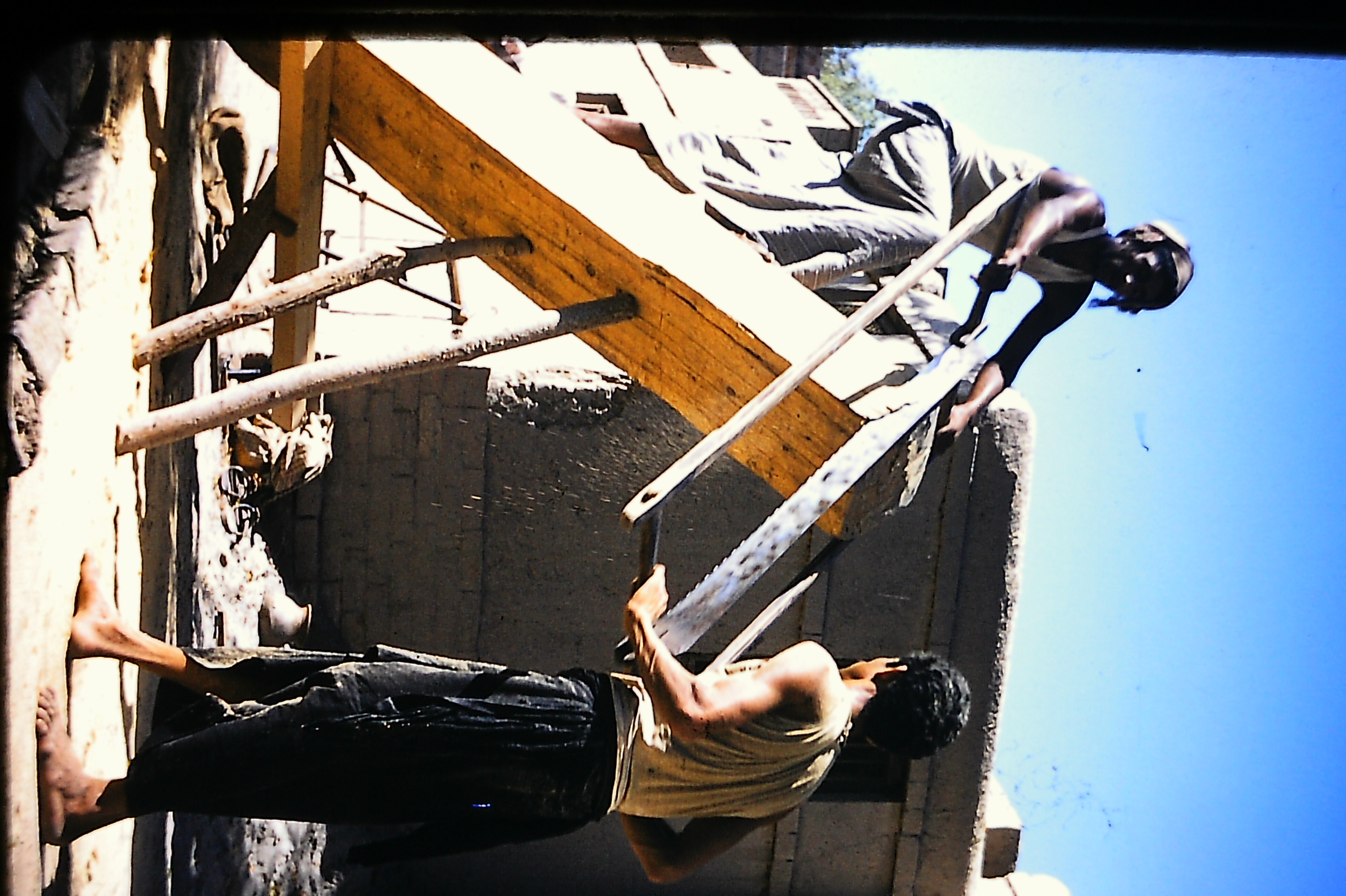 Clyde took many of these images in 1960. They are incredible photographs, especially the separation of the wheat, and the two men planing the long timber by hand. Most of the slides are numbered in pencil, and labeled “Harvest.” I like to imagine him sharing these images with local farmers back home in Kansas.