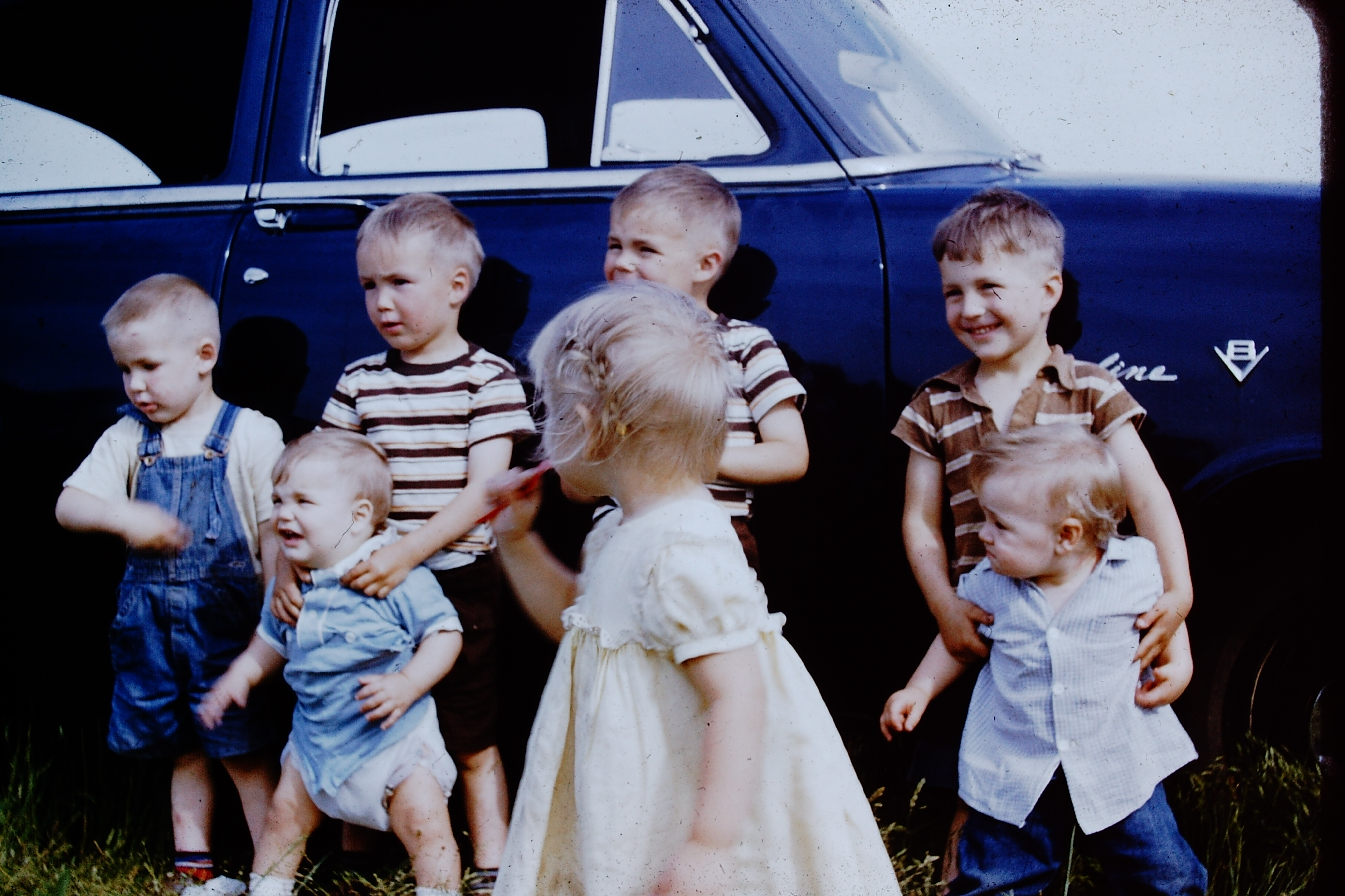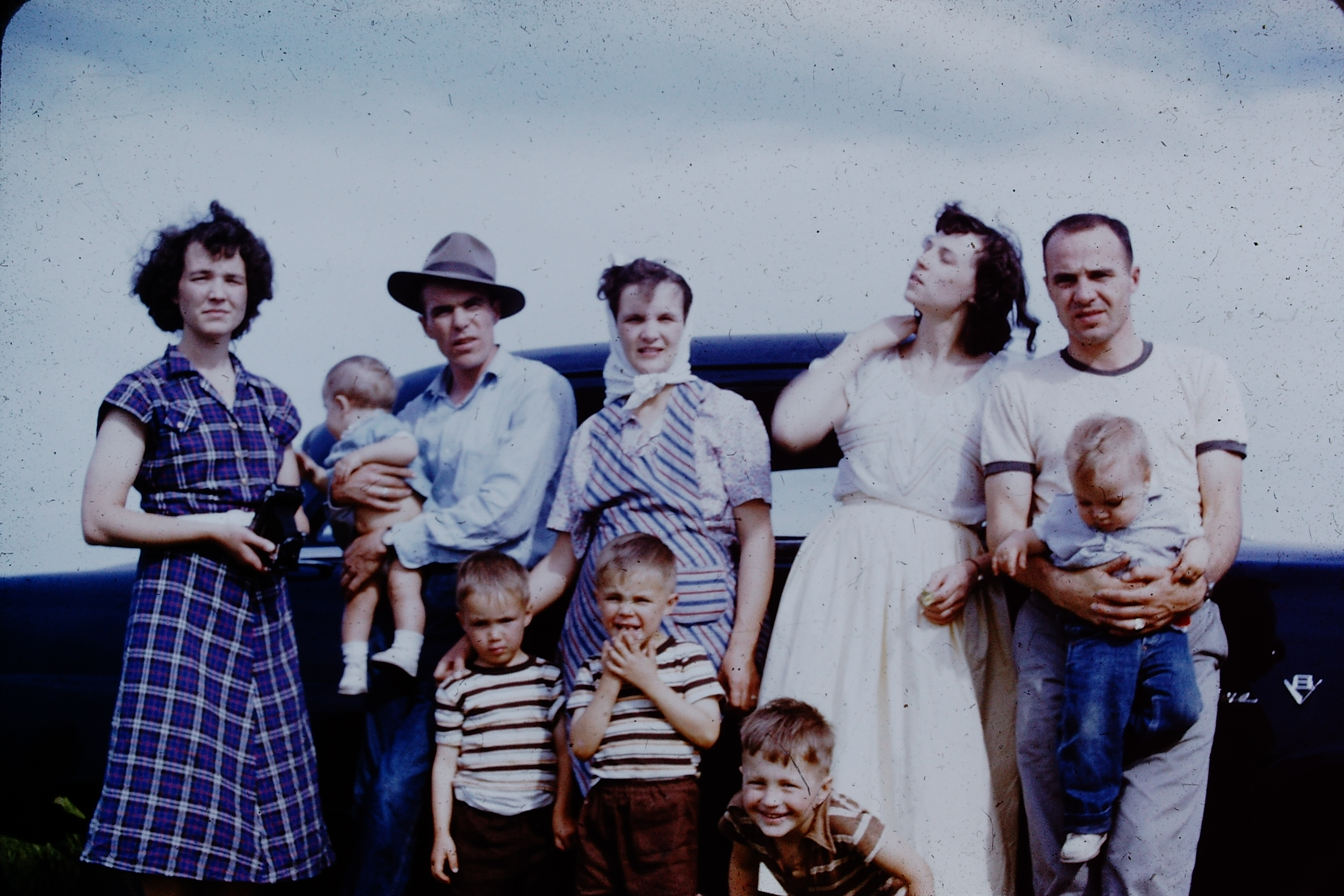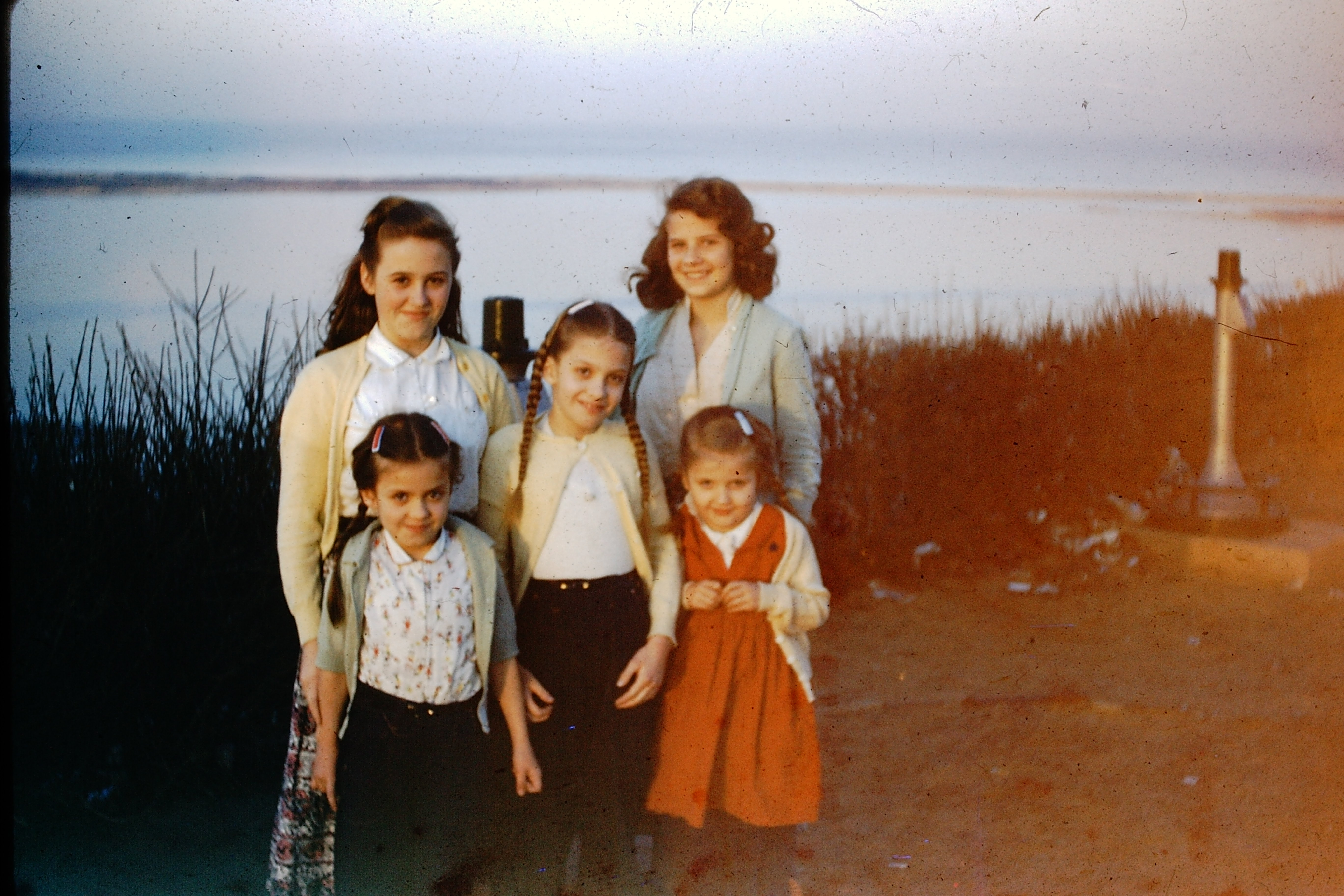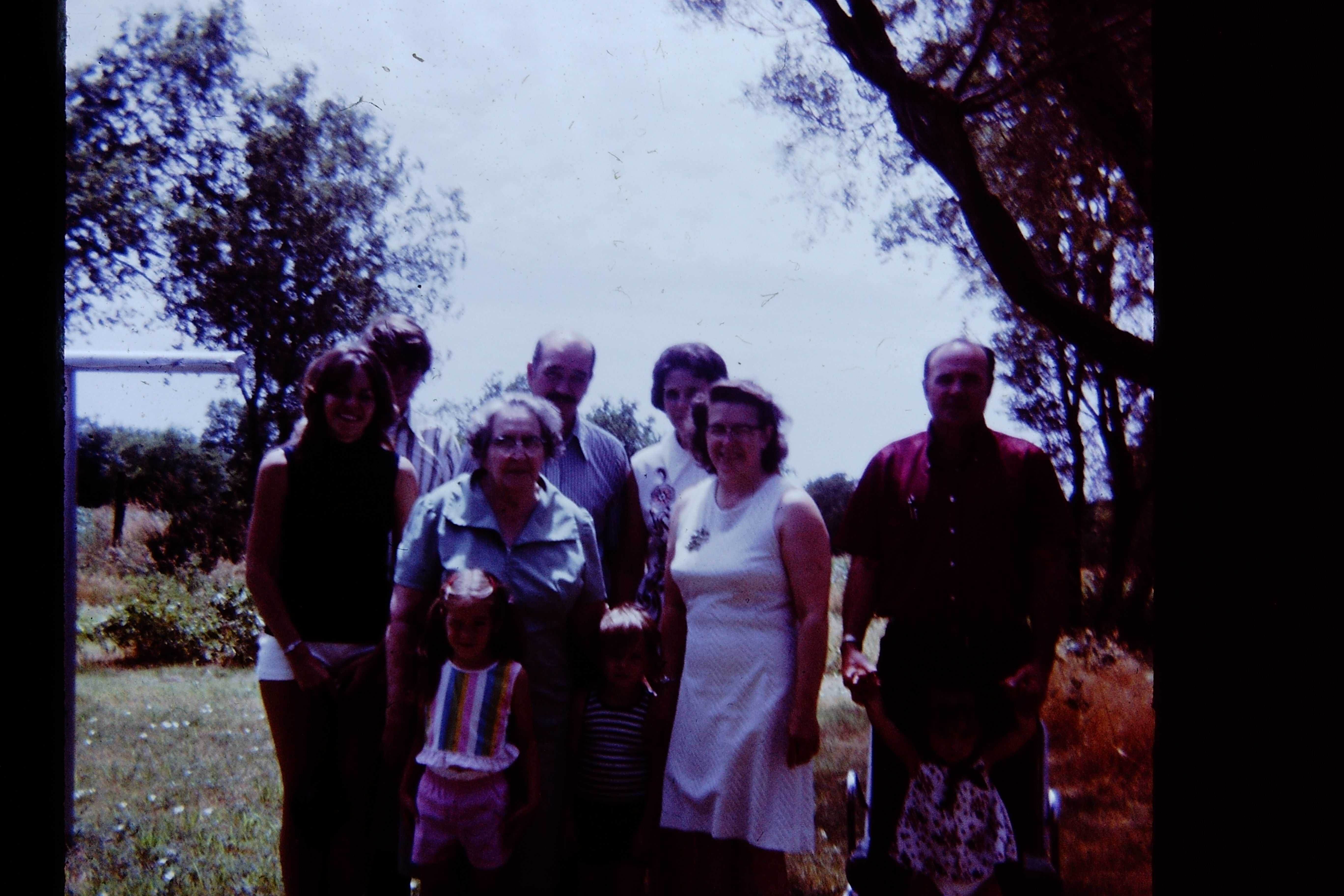 Tara Priddy Hardy, her husband Max Hardy, Clyde’s mother Isabelle, Clyde behind her, Mary in the white dress, Jerry behind her, and uncle Chuck. The kids, left to right: Kathy, Sean Priddy, and Tara’s oldest child Bobbie(?) Taken at Grandma Johnson’s farm around 1968.Clyde’s daughters Kathy and Grace, my mother. Early-mid 1970’s